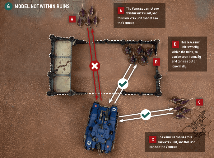 1. Is either a ruin (the actual terrain item) or an area terrain (aka the “footprint” of the feature, or the grey shape provided in the Tournament Companion) between the base of the attacker and the base of the defender? If so, then the defending unit is not visible. This is the case for the infantry group A and the Vehicle pictured below. Note also that if a vehicle lacks a base, its hull (outermost points of the body’s armour panels) is considered to be the “base” for all rules purposes discussed here.