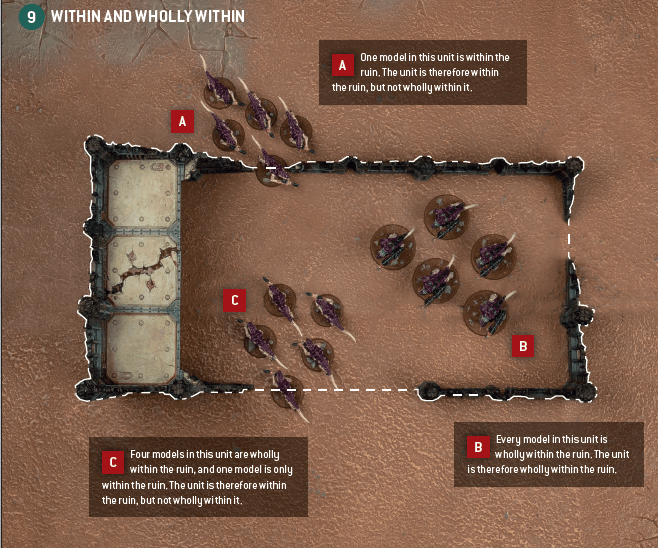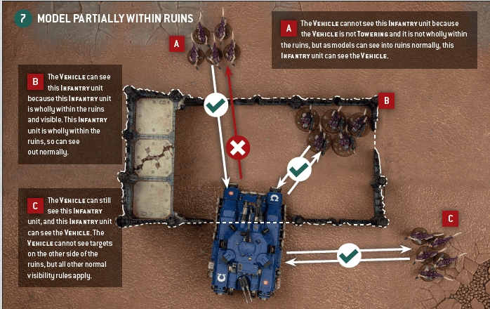 Just remember: the same does not apply for a model wholly outside of a feature targeting a model partly within a feature. Although it is highly illogical, if a model outside of a ruin (beyond the “far wall”) is shooting a model that is partially within an area terrain feature, it is able to do so, though the reverse is not true.