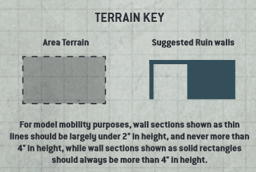 A key distinction should be made with reference to the layouts provided. First, Games Workshop has provided two different colors and outlines corresponding to different suggested kinds of terrain: Ruins and “Area Terrain” (LTC, 4-6).